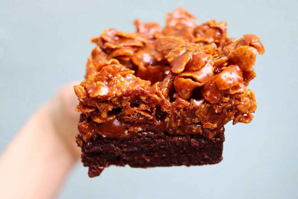 A dense, dark chocolate brownie with a generous amount of caramel cornflakes on top, it’s sticky and crunchy, super rich and a little salty.