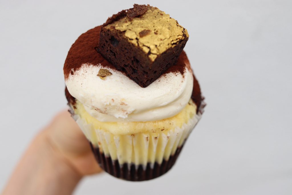 A dual base of dark chocolate brownie sponge and cheesecake – half bitter, half sweet, both super creamy – cream cheese frosting, cocoa powder and a bite-sized, gold-dusted brownie on top. This is pure indulgence.